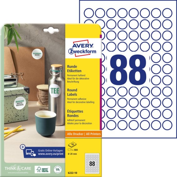 Etykiety okrągłe A4 10 ark. 20 mm białe trwałe 6222-10 AVERY ZWECKFORM