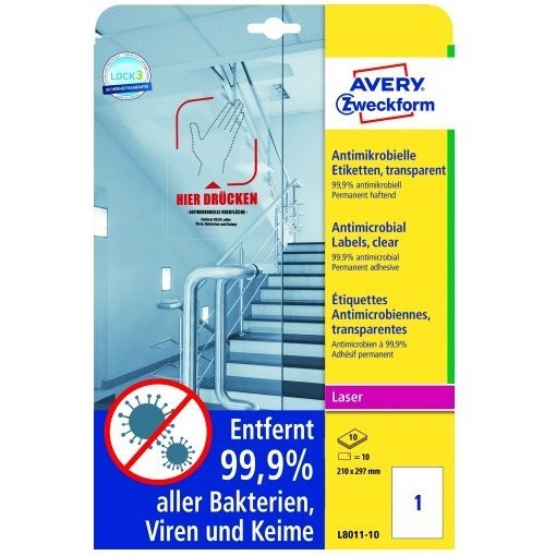 Przezroczyste, trwałe folie samoprzylepne L8011-10 w formacie 210 x 297 mm z długotrwałym, samosterylizującym efektem, który jest gwarantowany przez co najmniej 1 rok.