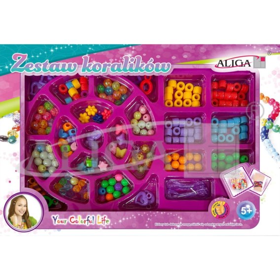 Zestaw koralików plastikowych mix kolorów i kształtów op. ok. 170szt.+2x 120cm żyłka PJ-1985 ALIGA