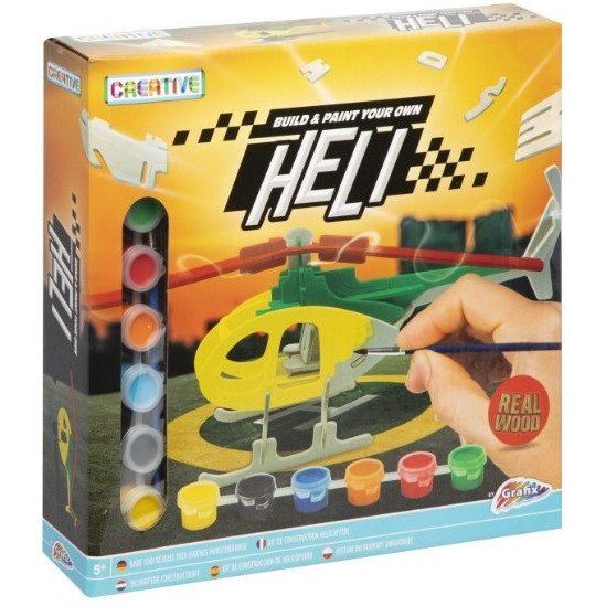 Drewniany helikopter konstrukcyjny, w zestawie 6 farb i pędzelek. Wymiary opakowania: 26 cm x 5 cm x 26 cm. Helikopter do złożenia z drewnianych puzzli, efekt 3D. Drewniane elementy można zostawić surowe, bądź pomalować je załączonymi do zestawu farbami. W opakowaniu 6 kolorów farb i pędzelek. Stworzony własnoręcznie helikopter może posłużyć do zabawy lub posłużyć jako dekoracja kolekcjonerska. Przeznaczone dla dzieci powyżej 5 roku życia.
