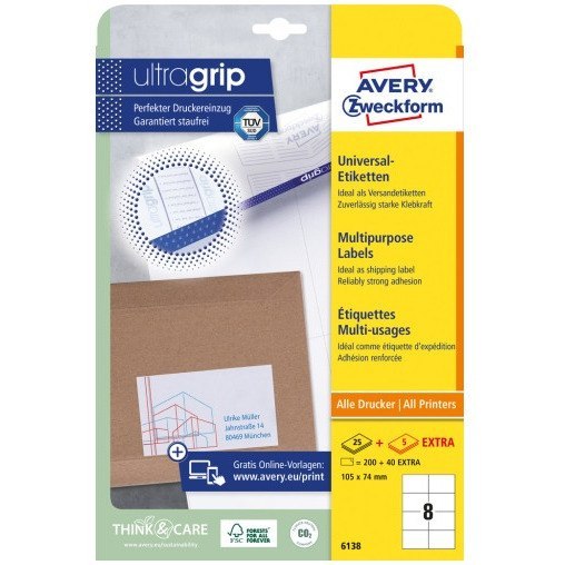 Najwyższa jakość od eksperta: Białe etykiety uniwersalne 6138 w rozmiarze 105 x 74 mm od Avery Zweckform przyklejają się w sposób absolutnie niezawodny i trwały do papieru, kartonu, szkła i wielu standardowych materiałów syntetycznych. Etykiety są doskonałym rozwiązaniem do etykietowania plików, dokumentów i wielu innych zastosowań w biurze lub do pracy w domu i prywatnie. Ten format jest idealny do adresowania listów (200 etykiet/paczkę + 40 etykiet EXTRA).