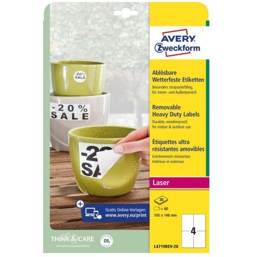 Białe, foliowe etykiety Heavy Duty L4718REV-20 w formacie 105x148mm do drukarek laserowych od AVERY ZWECKFORM są szczególnie wytrzymałe oraz odpowiednie do użytku zewnętrznego. Zawartość: 80 etykiet z matowej folii poliestrowej na 20 arkuszach w opakowaniu. Etykiety pewnie przylegają do oklejanej powierzchni, ale jednocześnie można je łatwo usunąć bez pozostawiania śladów kleju, dzięki czemu idealnie nadają się do czasowego oznaczania np. znaków, promocji i innych informacji. Etykiety wykonane z wytrzymałej folii poliestrowej są wodoodporne, odporne na zabrudzenia, zmienne warunki atmosferyczne, temperatury (od -20°C do +80°C) oraz rozdarcia.