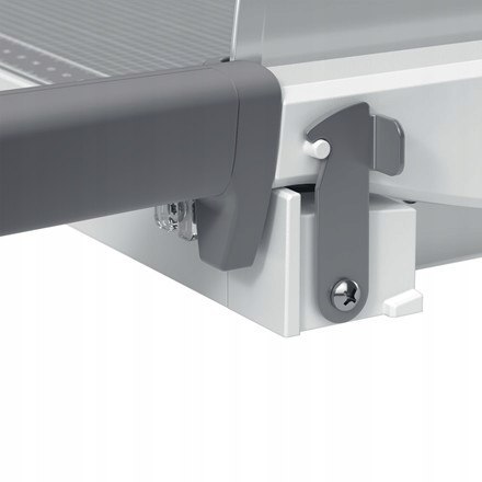 Przezroczysty reczny docisk przytrzymuje papier na miejscu, podczas gdy ergonomiczny uchwyt zapewnia latwe i wygodne ciecie. Dzieki naniesionym na laminowaną powierzchnie roboczą liniom siatki metrycznej, precyzyjnym oznaczeniom kątów i formatów, odpowiednie ulozenie papieru jest latwe i szybkie.