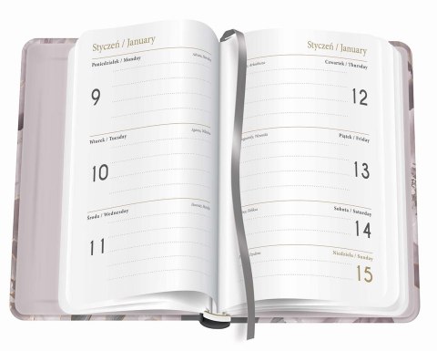 Format A6. Liczba stron: 192. Zaokrąglone rogi. Okładka z modnym efektem metalizy. W środku kolorowa wyklejka. Twarda oprawa skutecznie chroni zawartość przed zniszczeniem. Elastyczna gumka chroni luźne notatki przed wypadnięciem. Kalendarium w układzie 1 tydzień na dwóch stronach. Kartki w kropki do notatek, planowania i rysowania. Miejsce na notatki pod każdym dniem. Wyposażony w praktyczną tasiemkę do zaznaczania strony. W środku także: adresówka, praktyczne kalendarium oraz miejsce na dodatkowe notatki.