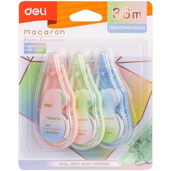 Jeśli szukasz skutecznego i wygodnego narzędzia do poprawiania swojego pisania, to zestaw 3 korektorów biurowych w taśmie z serii Macaron marki Deli jest idealnym rozwiązaniem dla Ciebie!