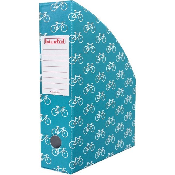 Wykonany z folii PVC z ozdobnym kolorowym nadrukiem; format A4 o ściętych bokach; wyposażony w kieszonkę z wymienną etykietą opisową na grzbiecie; okrągłe wycięcie na palec pozwalające na łatwe wysuwanie pojemnika; szerokość grzbietu 7 cm;