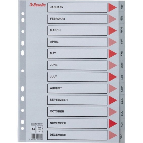 Przekładki plastikowe szare PP A4 12 miesięcy numeryczne 100114 ESSELTE