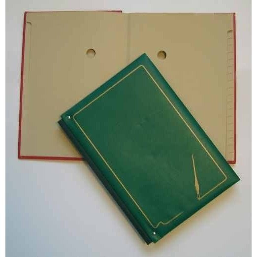 Okładka twarda, oprawiona w okleinę powleczoną PVC, z gąbką. Grzbiet harmonijka. Łączenie okładki z blokiem wzmocnione nitami. Blok z kartonu barwionego. Zawiera 20 kart z 2 otworami i korytarzem bocznym