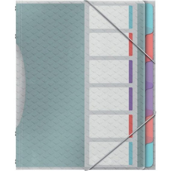 Posiada 6 róznokolorowych przegródek, wymienną przednią strone, dzieki której mozesz szybko i latwo oznaczyc kazdą przegródke, folder z 3 klapkami na luLne notatki umieszczony na tylnej okladce oraz latwe w uzyciu elastyczne zamkniecie, które zabezpiecza dokumenty w czasie przenoszenia.