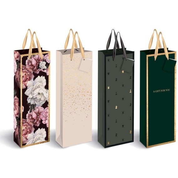 Wykonana z wysokiej jakości papieru 210 g. Eleganckie, matowe wykończenie. Złote, połyskujące detale w technologii hot-stamping. Wzmocniony, sztywny spód. Bilecik z miejscem na życzenia lub imię obdarowywanej osoby. Uchwyty wykonane z atłasowej wstążki. Idealna do szybkiego i efektywnego pakowania prezentów. Wymiary: 13x36x8 cm.