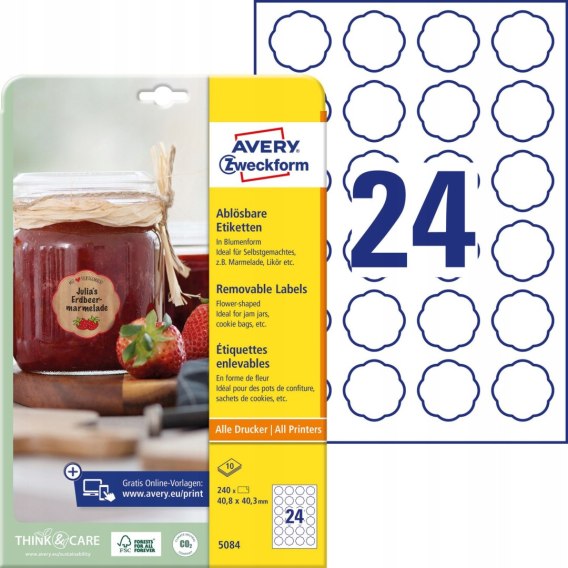 Usuwalne etykiety na przetwory A4 10 ark. 40,8 x 40,3 mm kształt kwiatu białe 5084 AVERY ZWECKFORM