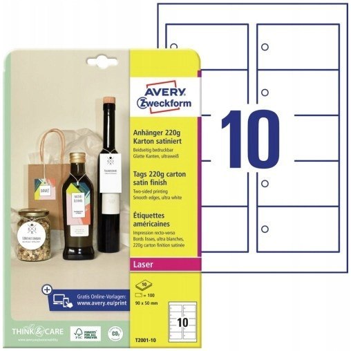 Biale, dwustronne zawieszki kartonowe Avery Zweckform do zadruku. Bardzo wysokiej jakości wykonane z wytrzymalego i przyjemnego w dotyku bialego kartonu. Mozna je dwustronnie zadrukowac lub opisac recznie.