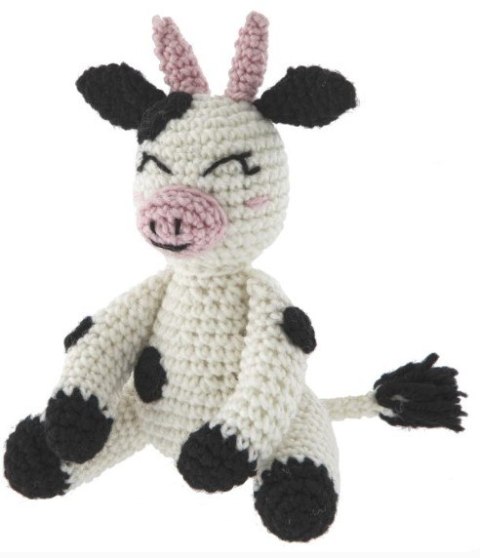 Zestaw do szydełkowania Krowa. Po zrobieniu maskotka ma wymiary 14 cm x 8 cm x 16 cm.
