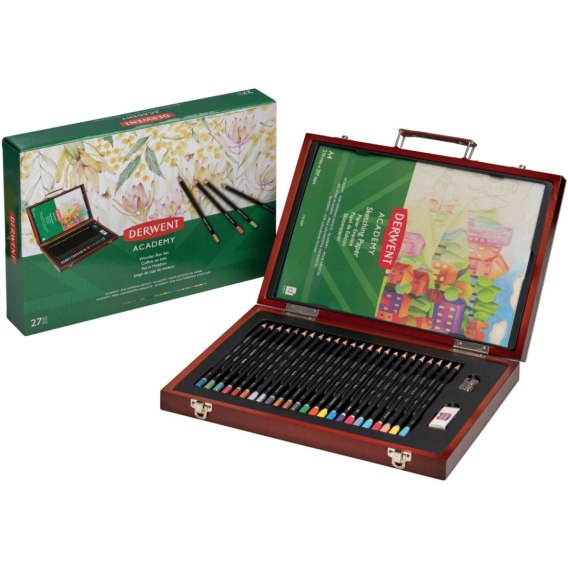 Zestaw Derwent Academy w drewnianym pudełku zawiera 27 elementów: 24 kolorowe kredki - 6 kredek Academy w kolorach pastelowych, 12 kredek Academy w kolorach metalicznych, 6 kredek Academy w kolorach neonowych, 1 gumkę, 1 temperówkę, blok rysunkowy A4 (12 kartek, 110 g/m²), 1 drewniane pudełko wielokrotnego użytku.